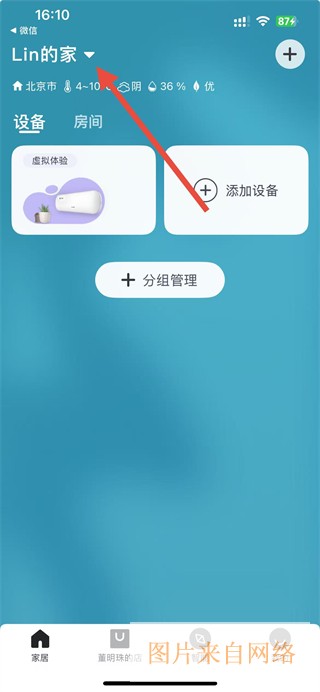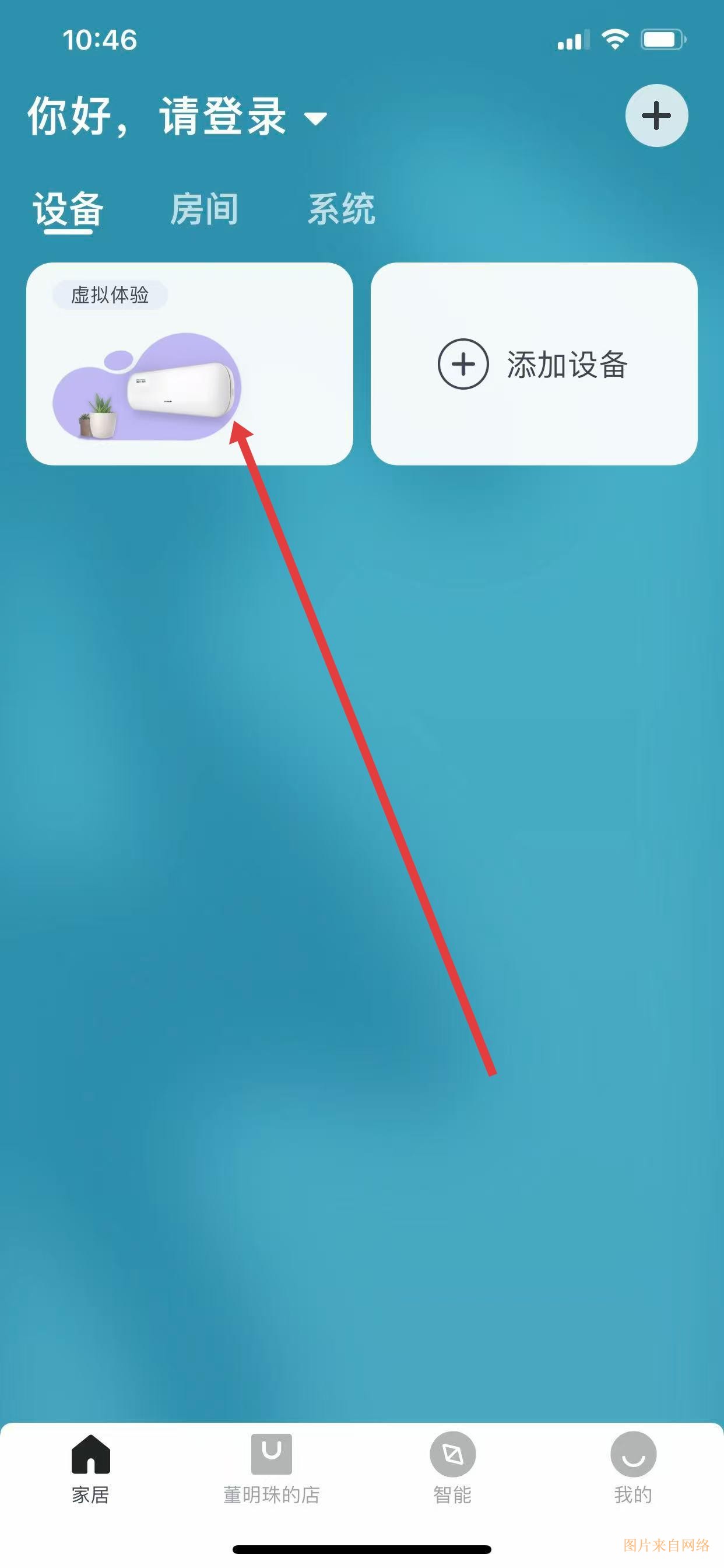 1、在应用首页的设备模块里,找到左侧标有虚拟体验、带有空调与植物图案的卡片,点击进入体验界面。