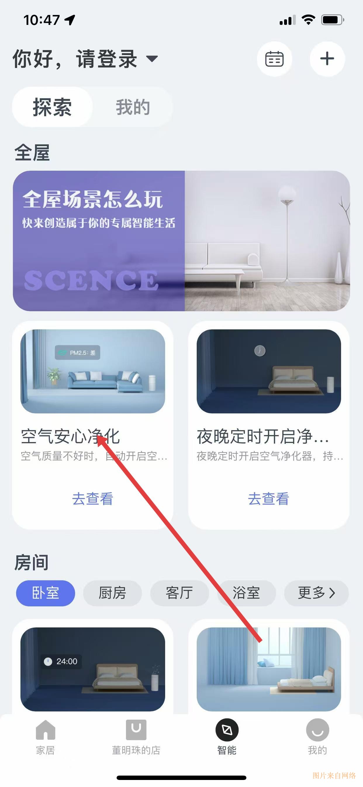2、切换至底部导航的智能页面,在全屋场景区域,选择左侧显示空气安心净化的卡片,查看功能详情。