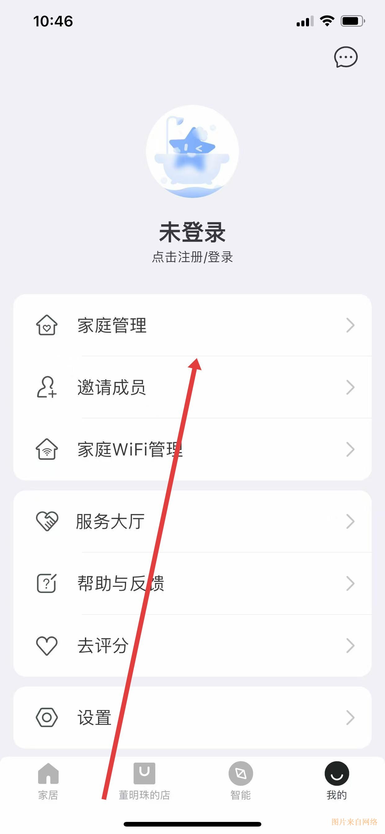 3、进入底部导航的我的页面,在未登录状态下,点击列表中首个家庭管理选项,开展家庭相关设置。