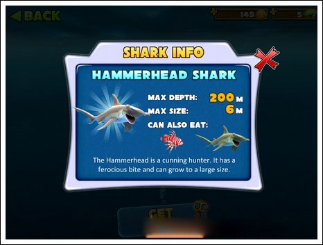 5、逐渐解锁更多水下凶猛野兽:灰鲭鲨、锤头鲨、虎鲨和无敌的大白鲨!