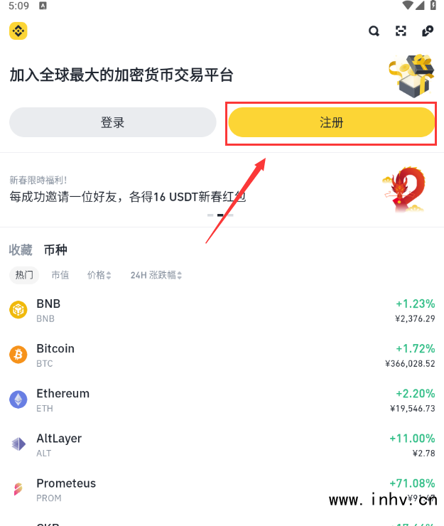 1.打开币安App,点击【注册】。
